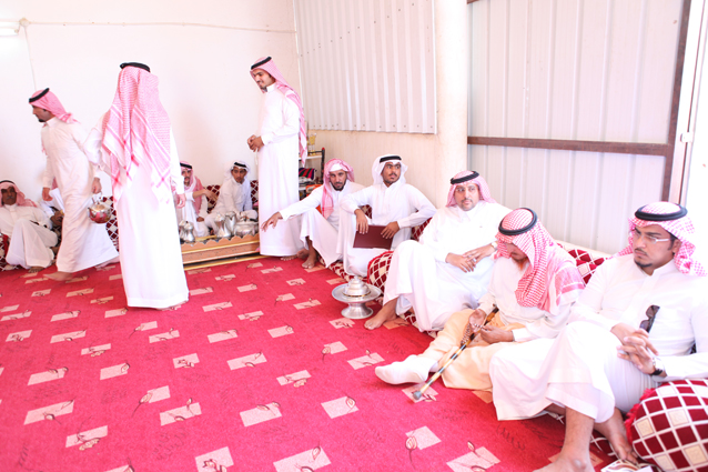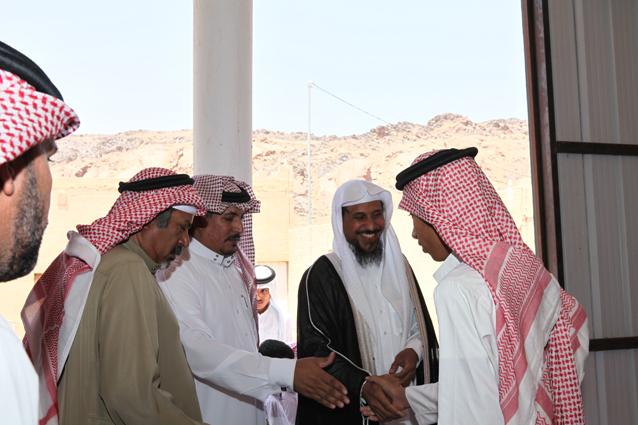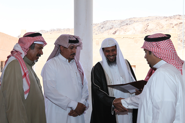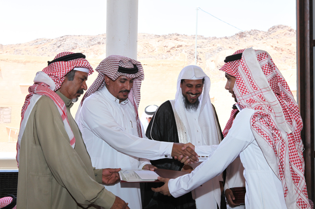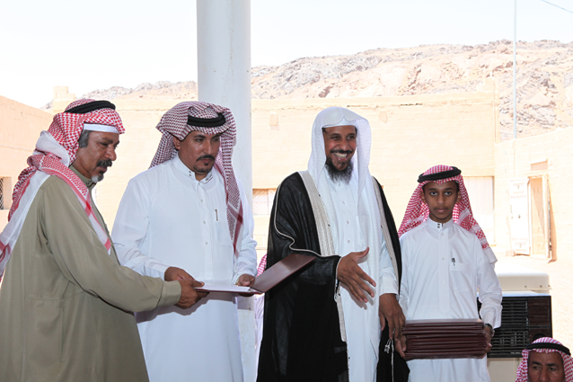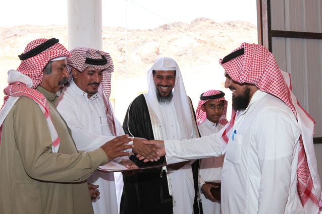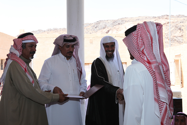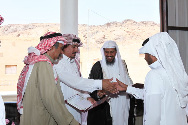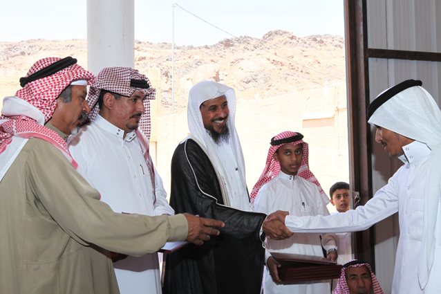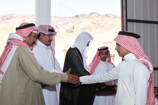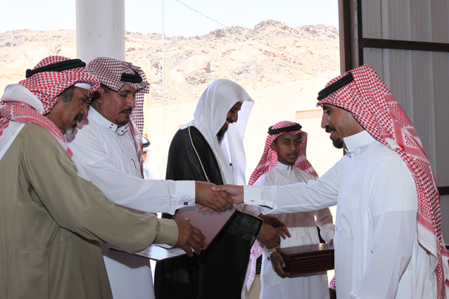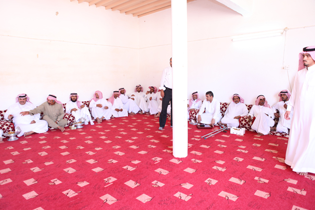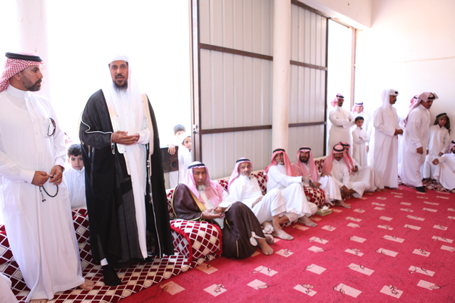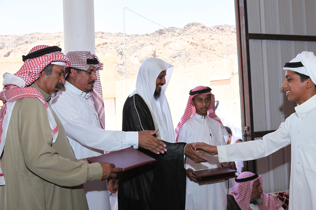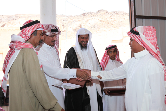 ويظهر في الصورة الشيخ محمد بن ركاد الويباري الشمري جالساً،والشاب صالح بن عبد العزيز الدعيلج حاملاً الجوائز وشهادات التقدير.
