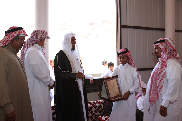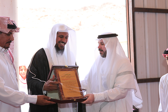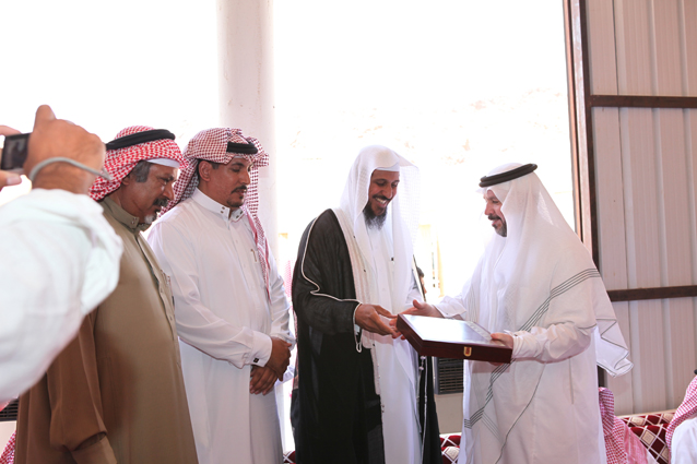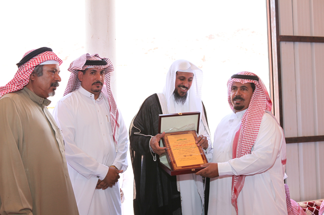 فضيلة الشيخ عبدالعزيز بن صالح الدعيلج يسلم أ. عبدالرحمن بن صامل الرويضي نيابة عن أبناء الشيخ صالح بن عبدالرحمن الشمري (رحمه الله) درعا تذكارياً بهذه المناسبة تقديراً لجهوده المخلصة ،حيث تولت مؤسسته تنفيذ مشروع الجامع ،ويظهر في الصورة الشيخ عبدالناصر بن سهو الشمري و أ. سعود بن سليمان الشمري